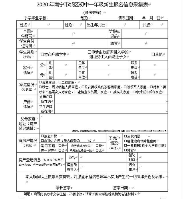 5月15日前,各小学召开小学毕业生家长会向学生家长介绍初中招生有关政策规定,指导学生家长填写《南宁市2019年小学毕业生信息采集表》,准备相应报名材料。