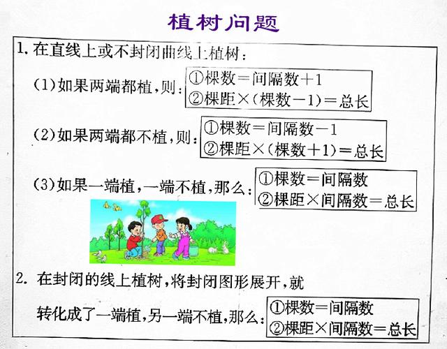 如果两端都植,则“棵数=间隔数+1”,总长=棵距×(棵数-1)。