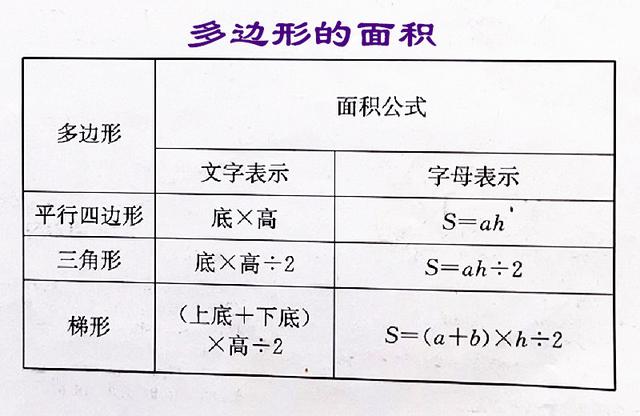梯形:面积=(上底+下底)÷2,(a+b)×h÷2。